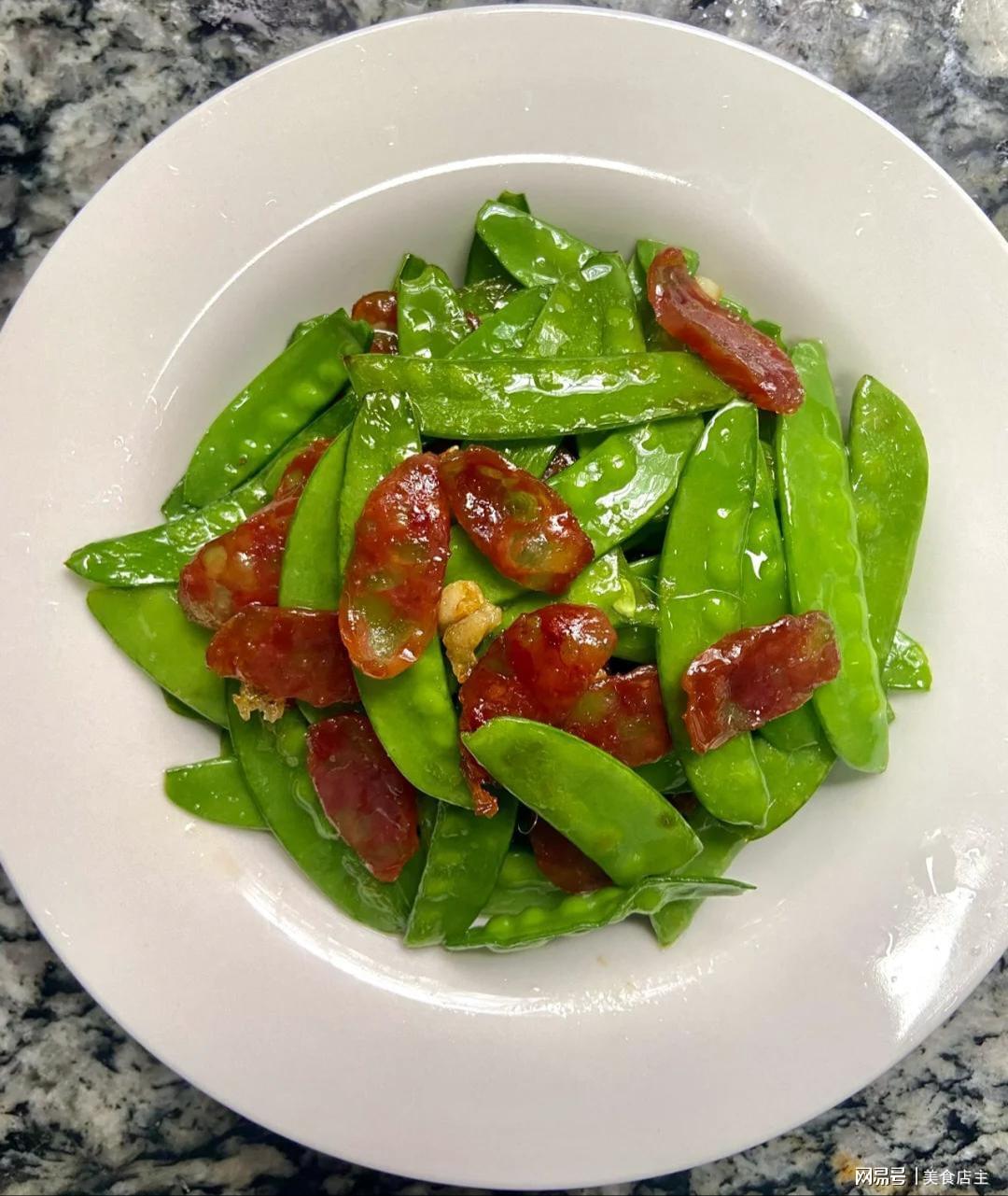 食材: 甜豆(或荷兰豆)200克,广式香肠2根,蒜2瓣,盐少许,糖一丁点。